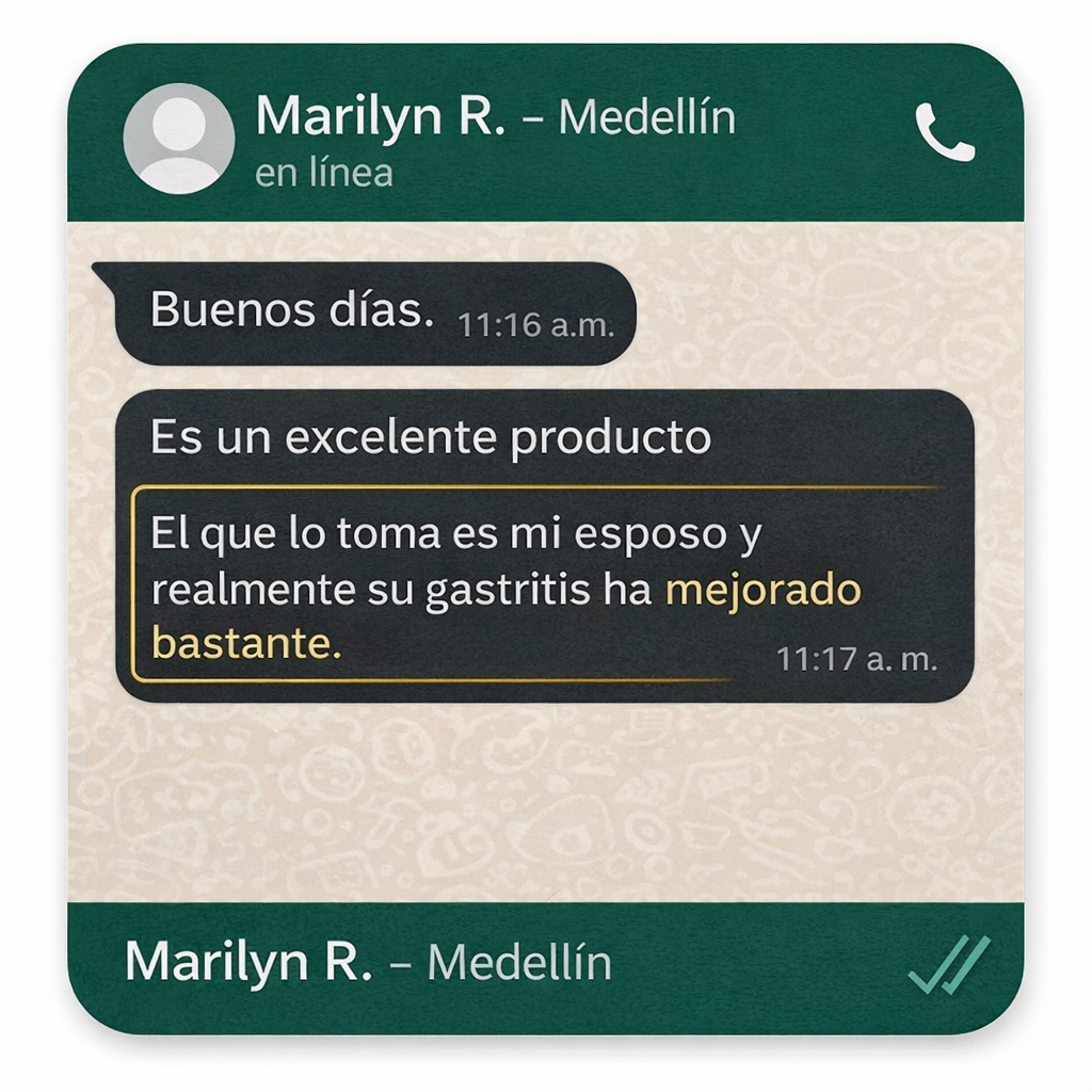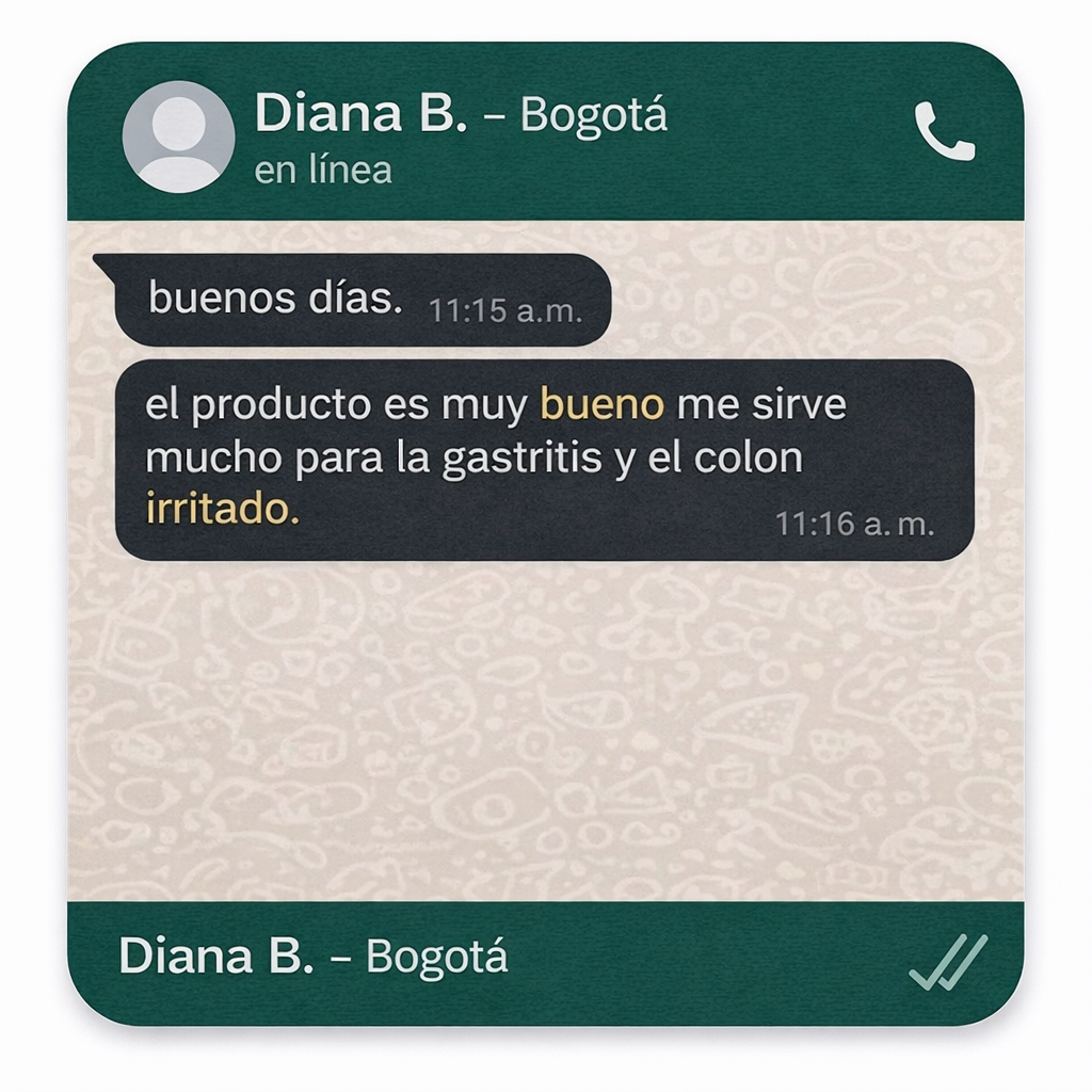“El producto es muy bueno, me sirve mucho para la gastritis y el colon irritado.”Testimonio real de cliente en Bogotá.