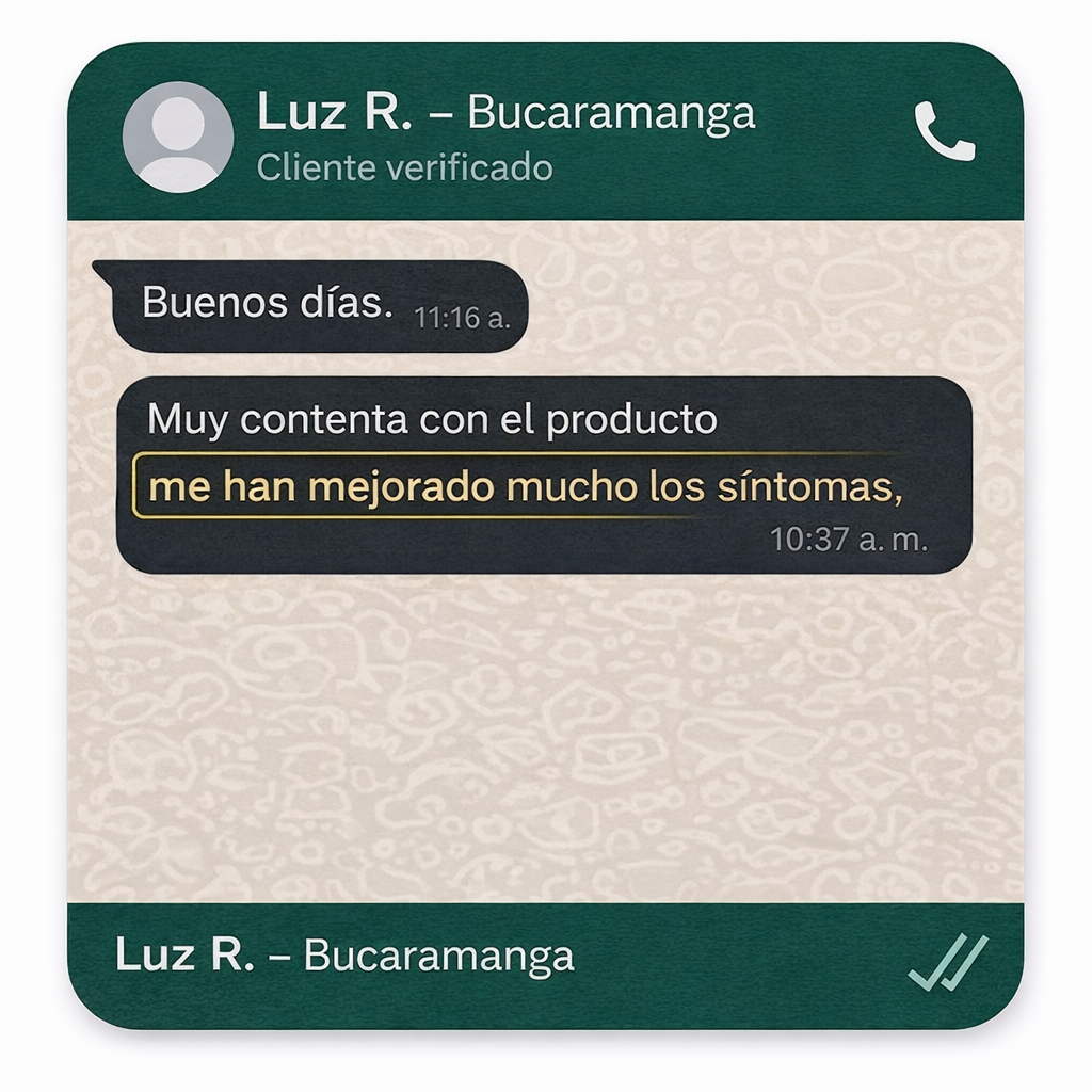 “Muy contenta con el producto, me han mejorado mucho los síntomas.”Experiencia real de cliente en Bucaramanga.